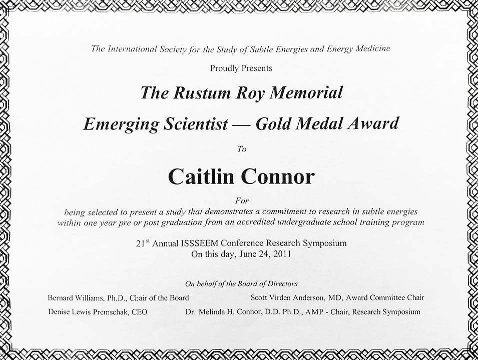 • 2011 Gold Medal – Dr. Rustum Roy, Undergraduate Emerging Scientist Award, International Society for the Study of Subtle Energy and Energy Medicine